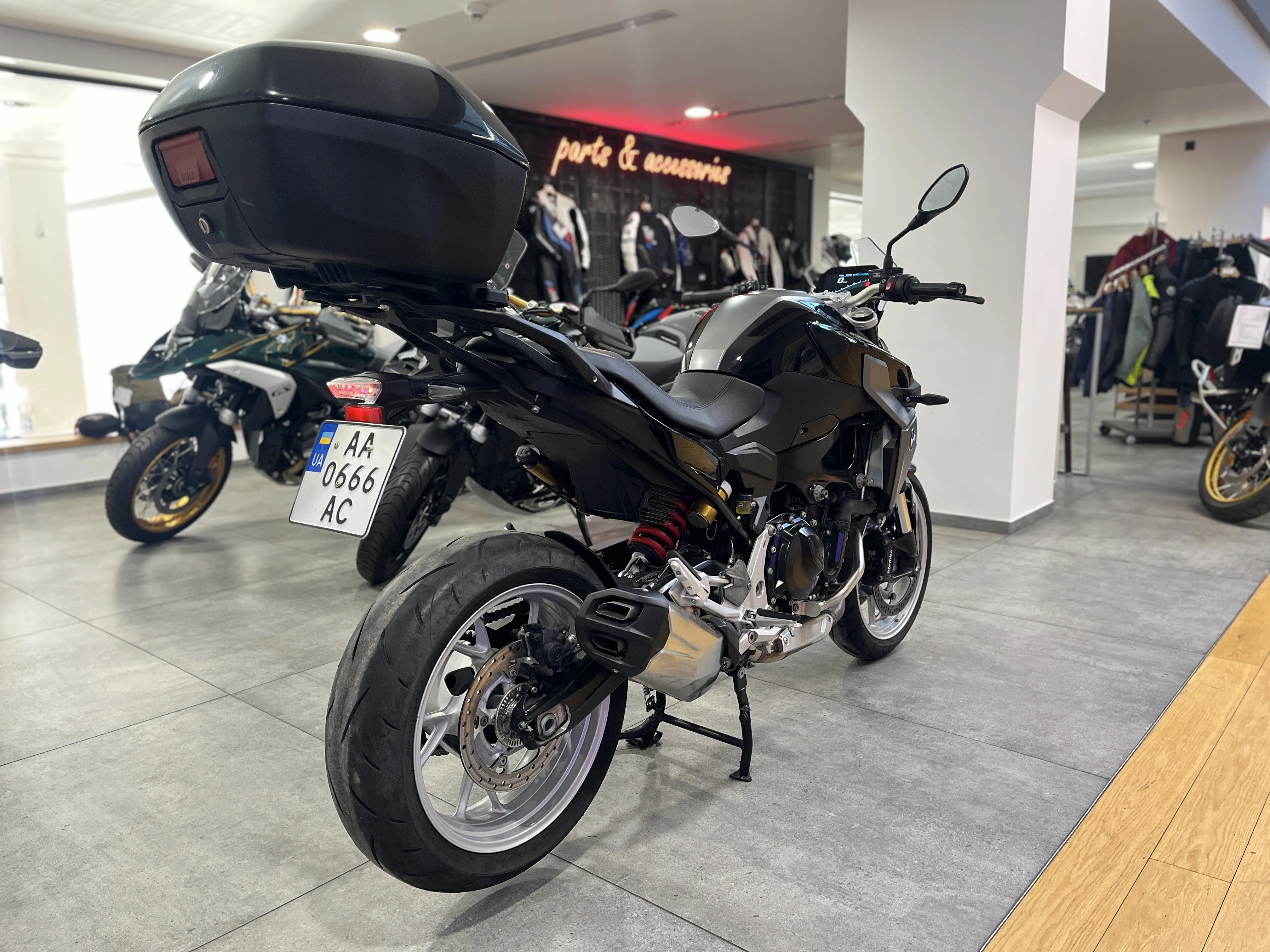 Паралельний алюмінієвий маятник; центральна амортизаційна стійка з пружиною Dynamic ESA; регулювання амортизації кнопкою в режимах Road/Dynamic; регулювання переднатягу пружини залежно від завантаження мотоцикла; робочий хід 142 мм |